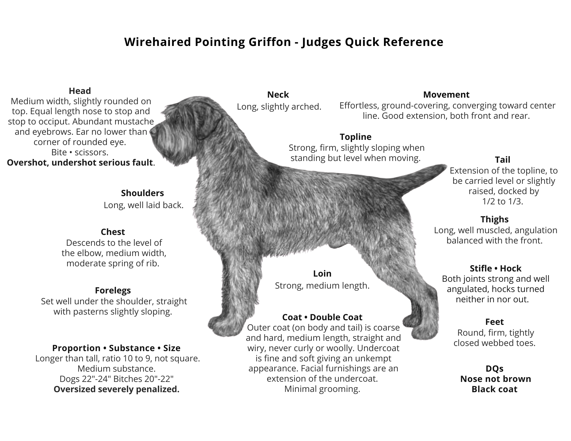 Size, Proportion, Substance: Size-22 to 24 inches for males, 20 to 22 inches for females. Correct size is important. Oversize to be severely penalized. Proportion-Slightly longer than tall, in a ratio of 10 to 9. Height from withers to ground; length from point of shoulder to point of buttocks. The Griffon must not evolve towards a square conformation. Substance medium, reflecting his work as an all-terrain hunting dog.